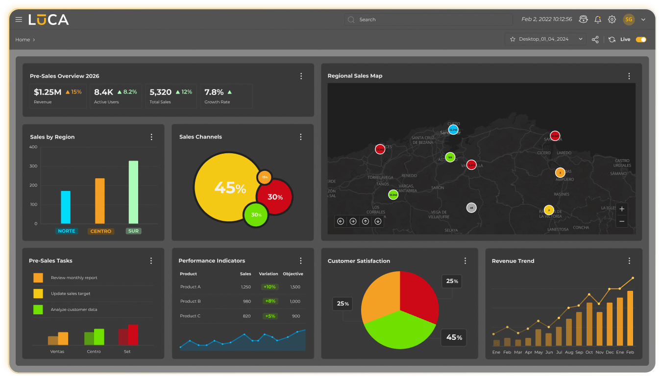 Explore the actual LUCA BDS platform with no obligation. Create your user account with your email address, access the interactive demo, and explore firsthand a fully functional platform with real data, configured dashboards, and multiple examples of the different elements that make up LUCA BDS.
